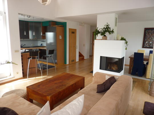 Dachgeschos (2.Stock), sehr hochwertig ausgestattet, u.a. kpl. Parkett, offener Kamin, Einbaumöbel, Tageslichtbad mit Badewanne + Dusche, zus. sep. WC im Schlafbereich, hochwertige, moderne, Einbauküche (mit Marken-Elektrogeräten), geschützte Süd-Loggia + 2 kl. Balkone mit Bergsicht, Kabelanschluss für Radio/TV