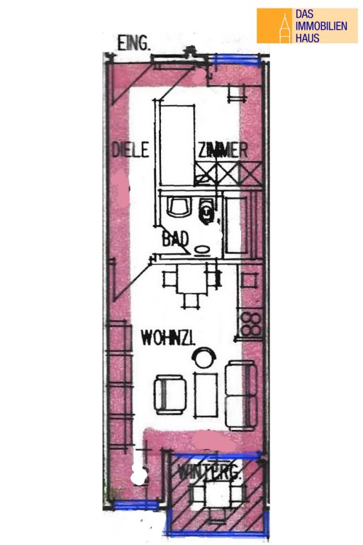 Die Wohnung ist wie folgt aufgeteilt: Eingang/Flur, Badezimmer (innenliegend - mit Badewanne, Waschbecken, WC), kleines (ca. 7,5 m² !) Schlafzimmer, Wohn-/Essbereich mit Zugang über eine Glasschiebetüre zum „Wintergartenerker“. In den „hinteren“ Wohnbereich ist eine Kochnische mit Einbauküchenzeile integriert.